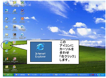 1. デスクトップ画面よりインターネットエクスプローラ(以下IEと言います)のアイコンを右クリックします。(デスクトップに無い場合はスタートボタンから選択します)