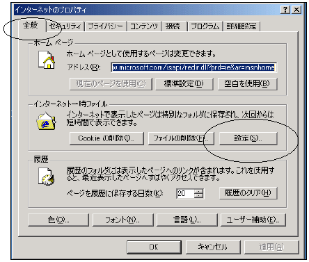 この画面で「全般」のタブを左クリックし、「設定(S)」ボタンを左クリックします。
