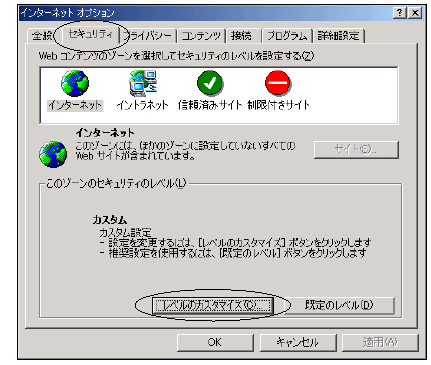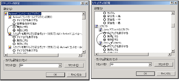 セキュリティレベルの詳細が表示されますので、ActiveXコントロールを「有効」にスクリプトを「有効」にして「OK」ボタンを左クリックして下さい。